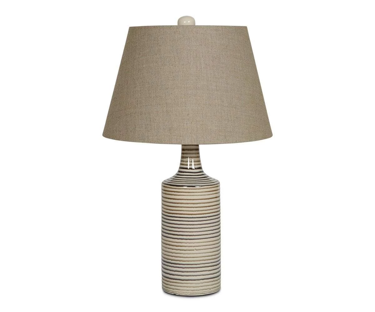 Illuminate your room while adding visual interest with the Viveka Table Lamp. Just the right size to suit many locations throughout your home without overtaking the space, its neutral colors easily blend with many styles of interior design. The glossy ceramic base features pleasing stripes which complement the texture of the beige fabric shade. Together, this piece becomes a practical accessory that adds personality to your decor.