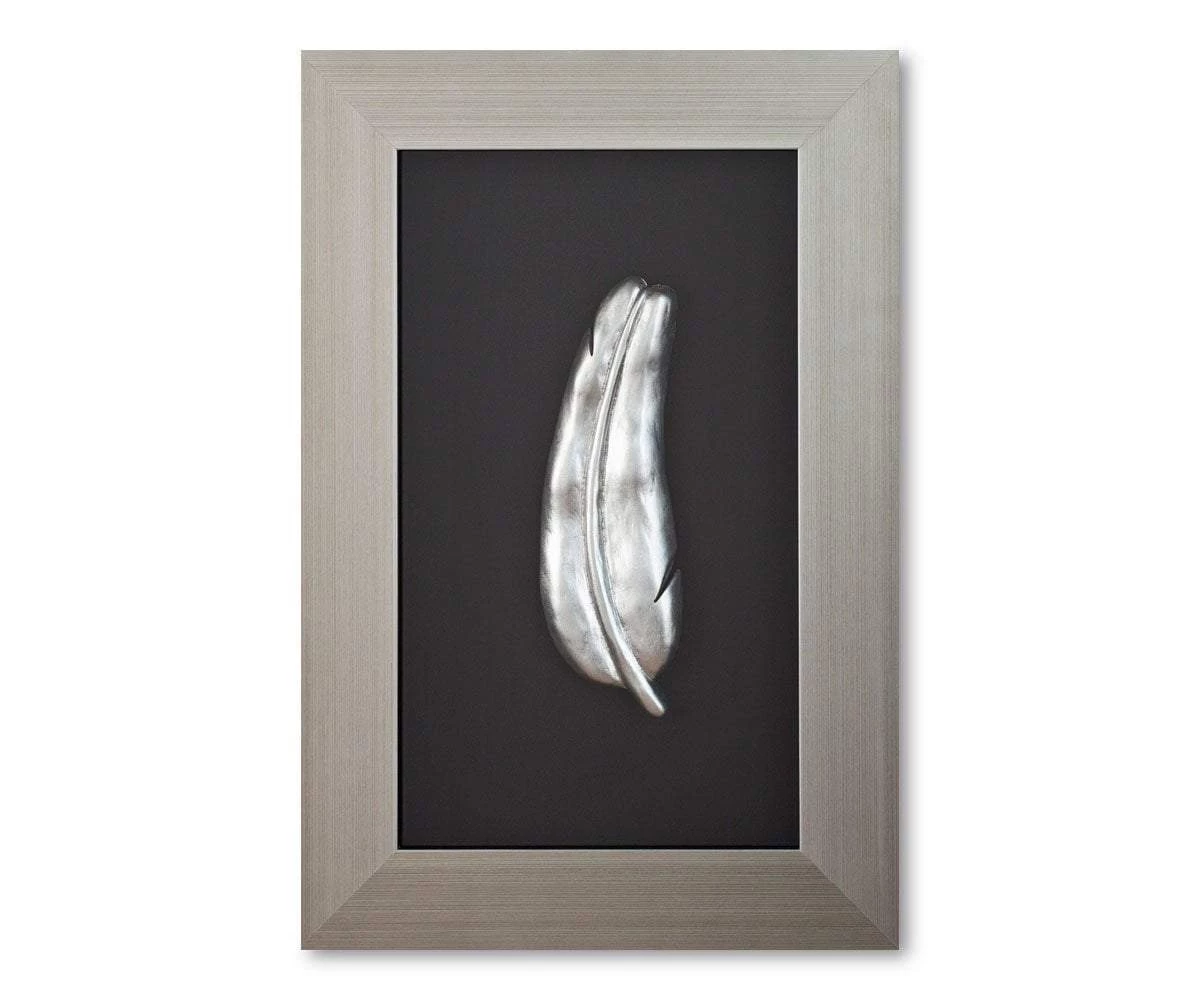 In the Tamalpais Wall Sculpture, a beautiful, curvaceous leaf is immortalized as a silver sculpture against a black background. Framed in a strong silver colored frame.