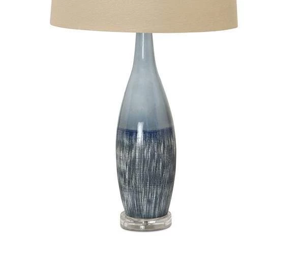 Ground your space with the earthy Lesja Lamp. Crafted from ceramic, the elegant and shapely base features a textured blue glaze finish. A coarse linen drum shade balances the profile.