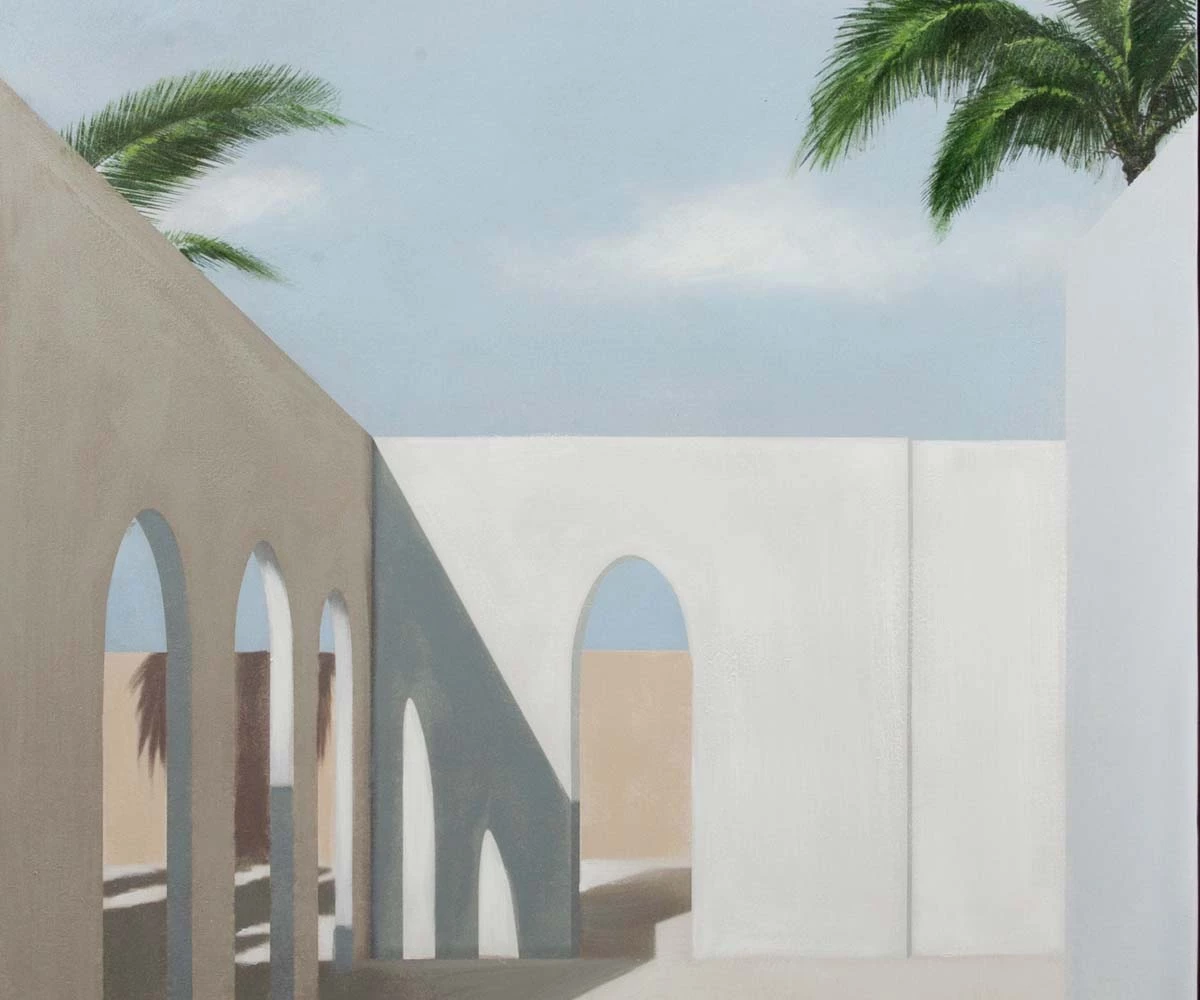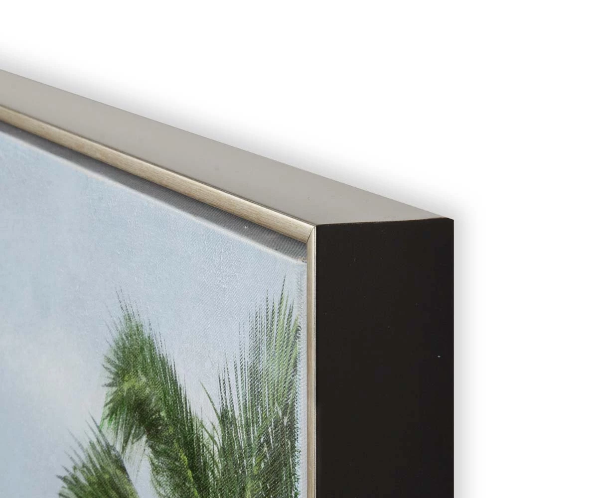 The Distant Escape I Oil Painting fills your home with the ambiance of faraway lands. Depicting a sunny cityscape punctuated with emerald palm trees, this piece captures the essence of tropical getaways filled with warm summer breezes and cool dips into a sparkling cerulean sea. Hand-painted with 100% oil paint on canvas, this piece is finished with a modern silver and black frame. The clean architectural motif of this contemporary painting can easily blend with any number of decor styles. Pair this piece with the Distant Escape II Oil Painting to sate your feelings of wanderlust and bring a sense of sun-drenched tropical escape to your home.Β Distant Escape II Oil Painting sold separately.