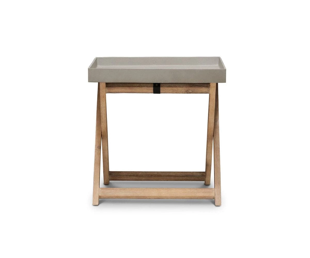 The Matera Square Tray With Butler is ideal for serving during parties or as a plant stand. The tray is made from a lightweight composite that looks like sandstone. The modern aesthetic is accented by the acacia wood butler, which folds up for easy storage and transport. Use this piece for both indoor and outdoor entertaining, as it is frost-resistant and waterproof.