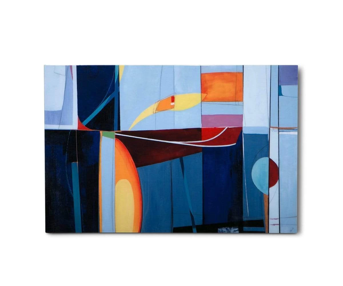 Abstract, colorful and layered, this piece of wall art works in modern, contemporary or mid-century spaces. A glossy finish elevates the aesthetic, and a plasma-mount frame makes it easy to display.
