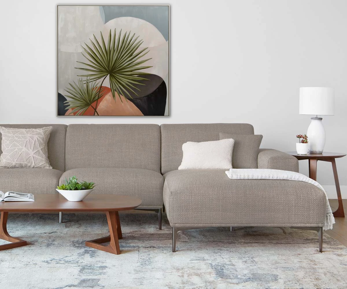 The Moonlit Fronds Oil Painting brings to mind the essence of balmy nights lit by a full moon. A modern, geometric take on island ambiance, this piece is hand-painted with 100% oil painting on canvas. A distinctive mid-century modern palette is set off by an airy white frame which plays beautifully off the similarly light tones in the painting itself. A pair of leafy palm fronds stand proudly in the foreground of this piece, while lovely organic shapes fill the background. Easily paired with the other Moonlit Oil pieces, this largest addition to the collection could sit comfortably as part of an artistically-oriented gallery wall, surrounded by the smaller Moonlit Oil paintings. Alternatively, this piece could be hung on an opposing wall to echo the tropical look and feel brought by the Moonlit Oil Painting Collection.