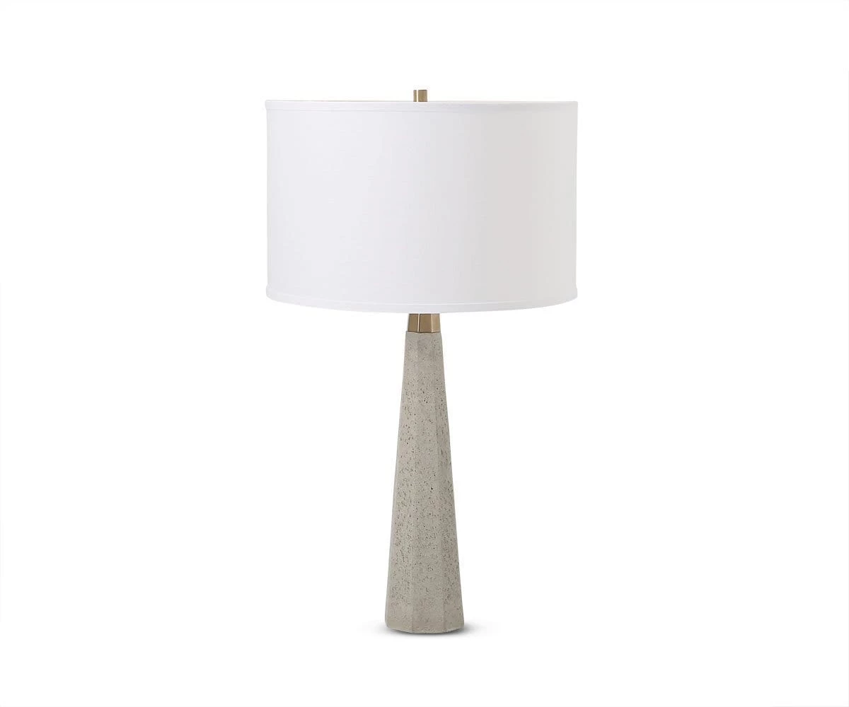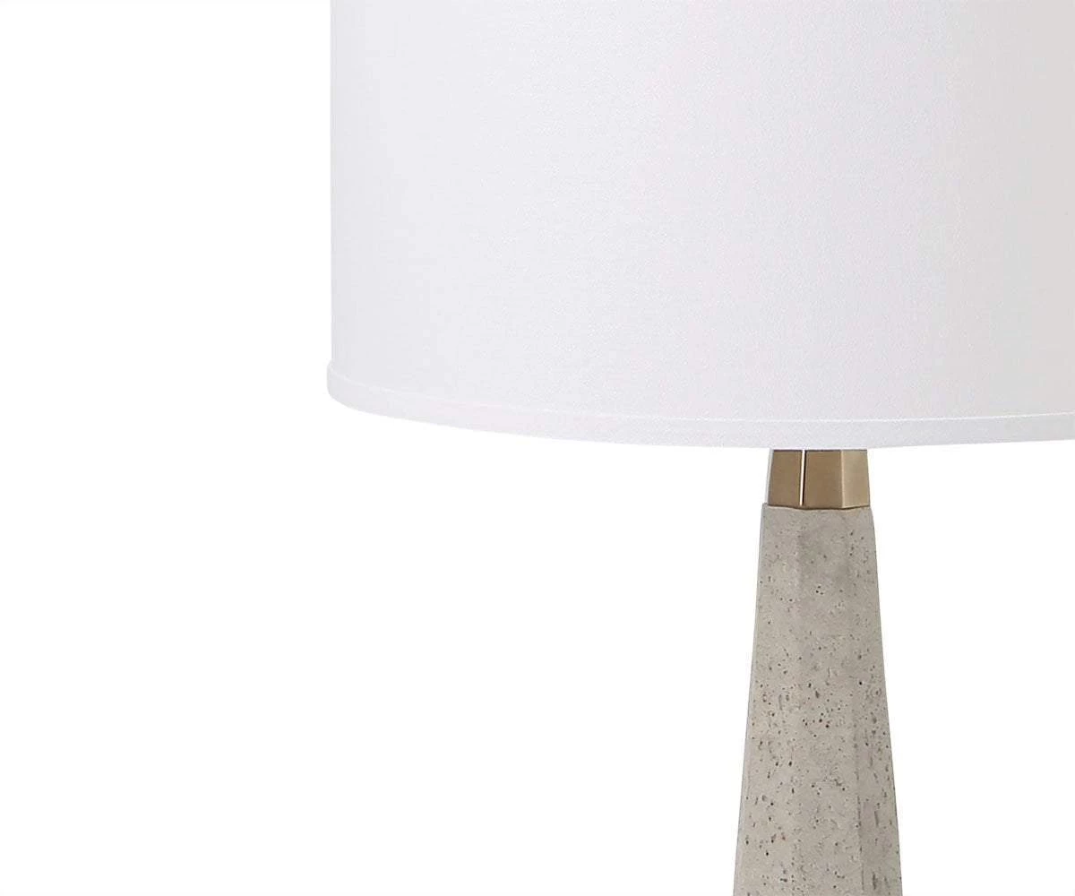 The Kolina Table Lamp offers contemporary elegance to any home setting. Unique to this modern fixture is the concrete base molded into an interesting geometric design which tapers at the top. Its smoothed form features naturally dappled markings, adding visible texture that is pleasing to the touch. Topped with a white barrel shade made from a cotton and linen blend, this piece will grab the spotlight wherever it is placed.