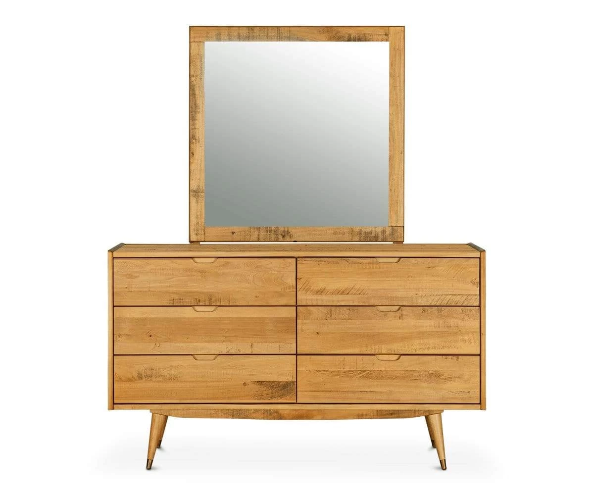 The square Bolig Wall Mirror is framed in solid American poplar with a distressed finish. Add light and rustic charm to your space with this piece that coordinates perfectly with the rest of the Bolig Collection. The rustic reclaimed look of this collection is achieved through an intentional distressing technique that applies burn and saw marks to the surface while retaining and highlighting natural characteristics in the wood. This technique results in a reclaimed driftwood appearance, which adds personality and a one-of-a-kind uniqueness to each piece.