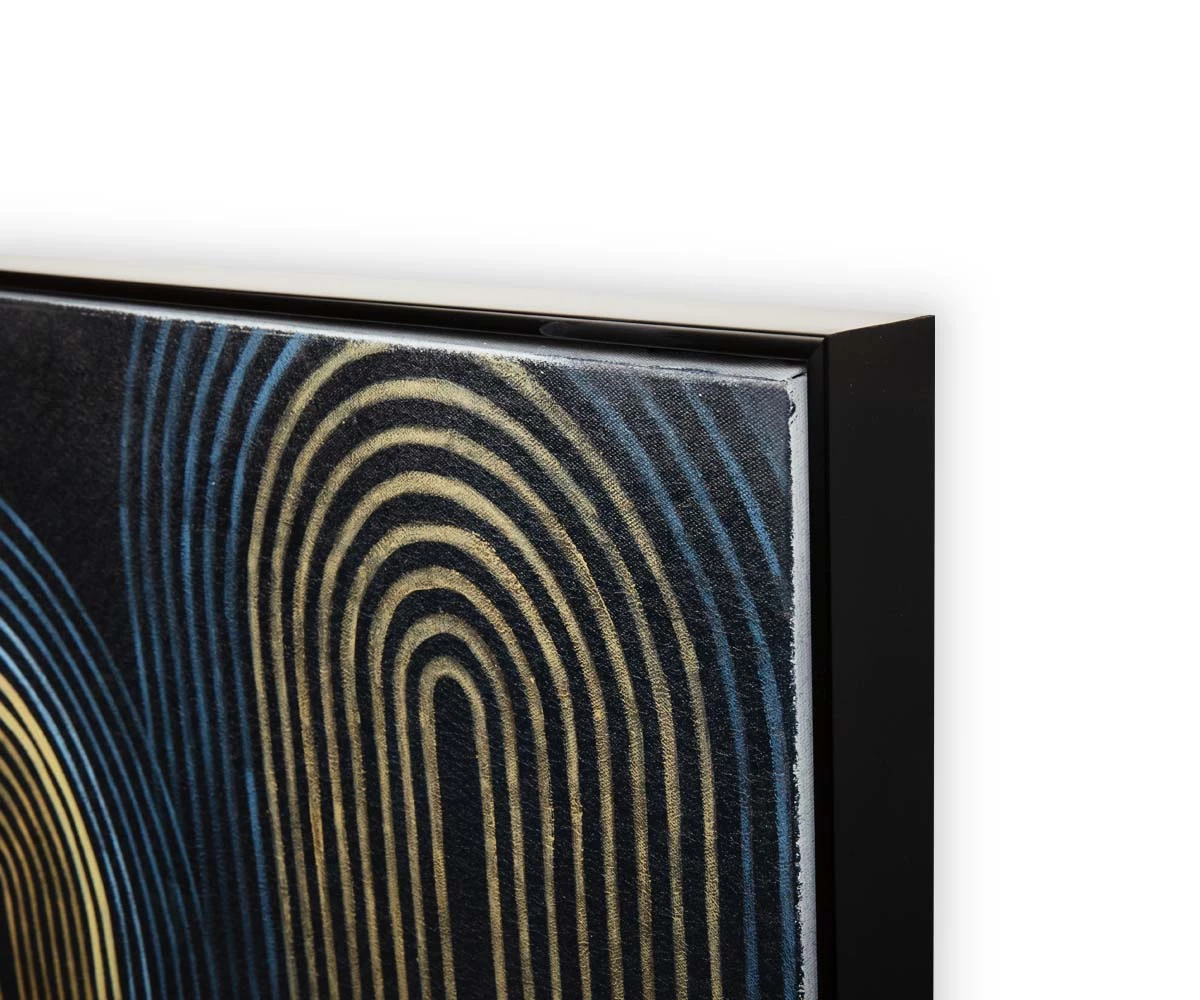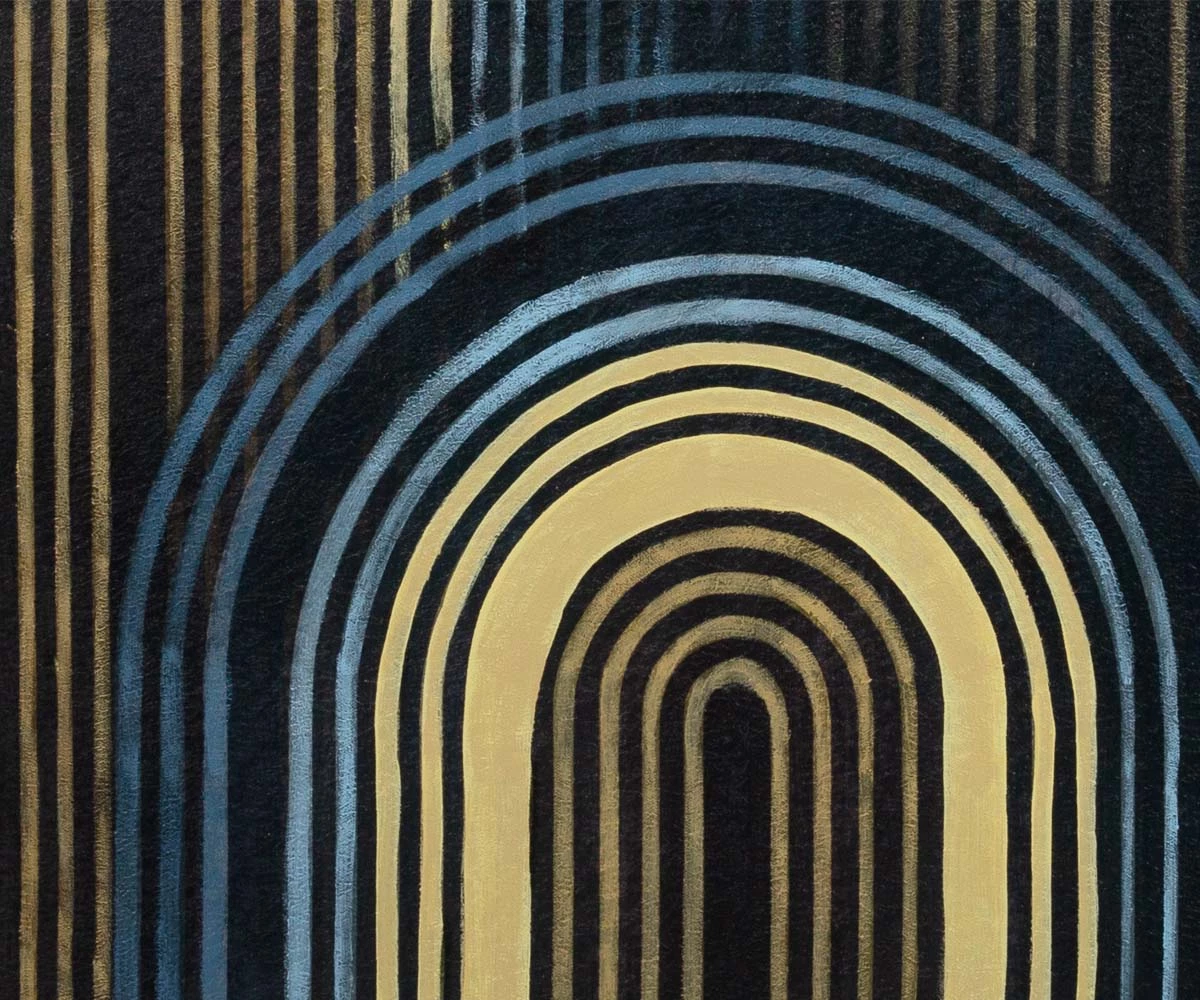 Anchor your aesthetic with the rich, dark hues of the Midnight I Oil Painting. Inspired by the vibrant contrasts and clean lines found in pop art, this piece showcases the inky curve of arches punctuated by bright lines that lend themselves to a dimensional, dynamic feeling. Hand-painted with 100% oil paint on canvas and set in a black frame, this modern piece pairs well with the Midnight II Oil Painting. Hang this duo on a wall together to create a gallery wall effect, or pair with the Midnight Mountain Oil Painting for a cohesive set of pieces that naturally infuse your space with a midnight motif.Β Midnight II Oil Painting andΒ Midnight Mountain Oil Painting each sold separately.