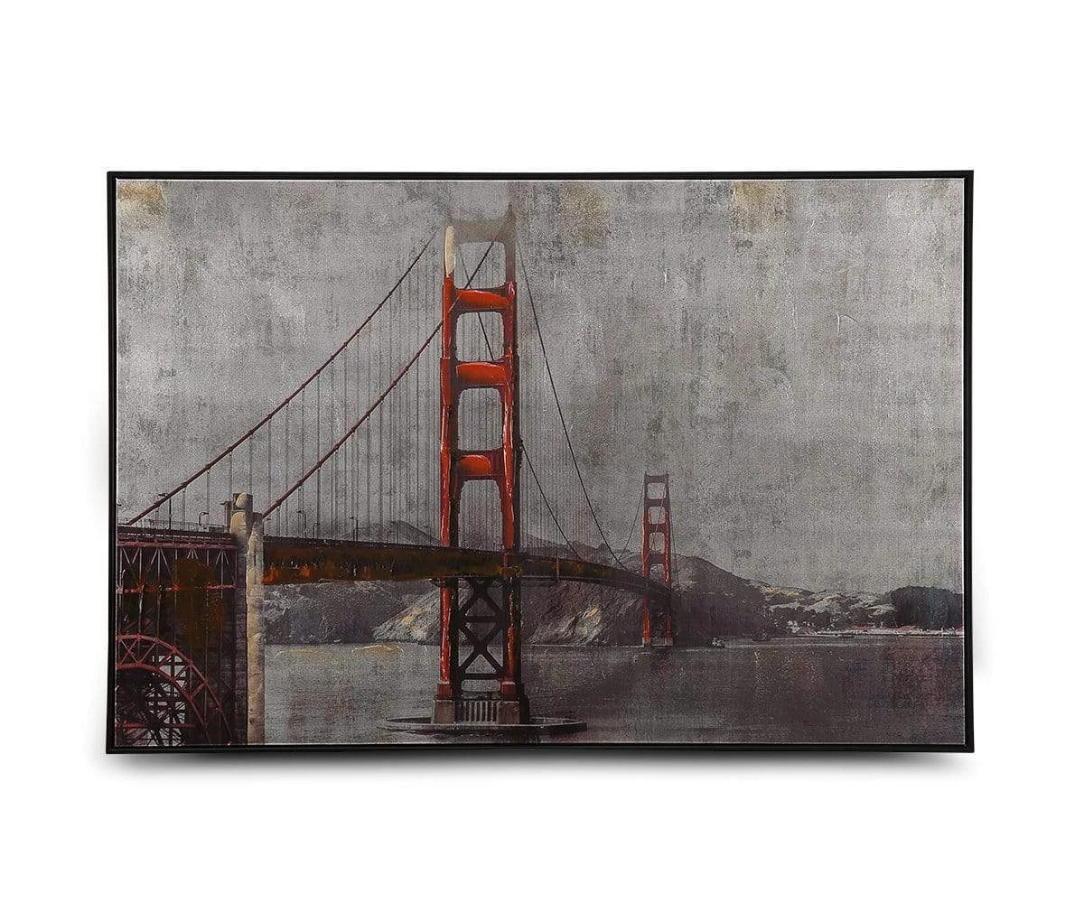 The Golden Charisma mixed media painting uses sweeping lines and expressive imagery to portray Californiaβs iconic Golden Gate Bridge. Completed in 1937, this magnificent landmark is believed to be the most photographed bridge in the world. This half print and half paint portrayal predominantly features soothing pewter tones accented with hints of gold that evoke thoughts of sunshine piercing through the Bay Areaβs notorious fog. Rolling hills span the background, while the delicately painted cables and towers of the bridge dominate the foreground in rich tones of brick red and crimson.
