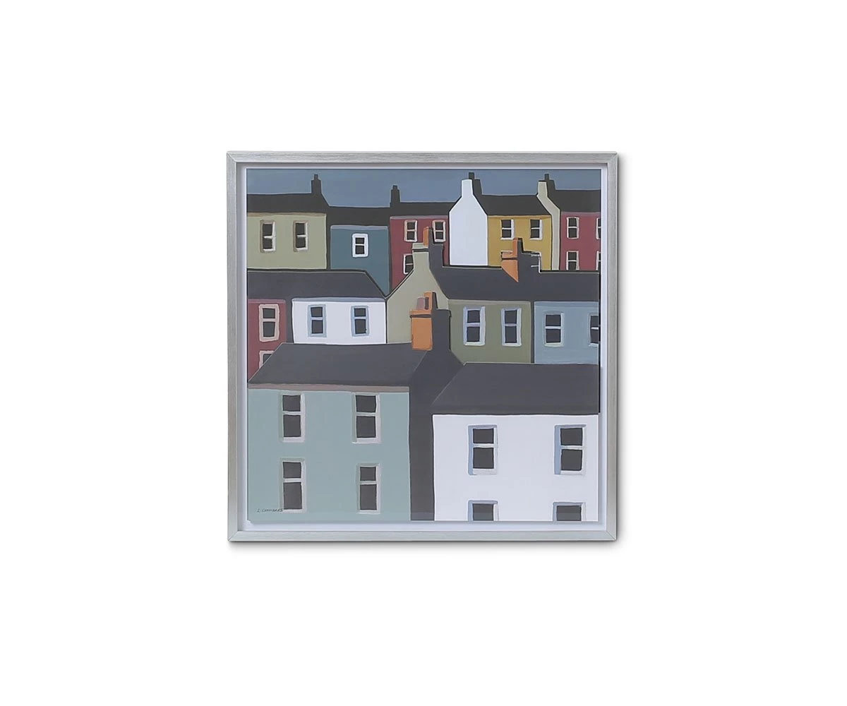 The Pleasant Medley Painting displays Modernism style and modern content with the depiction of colorful row housing. This urban scene is created with 3D paper layers. With a glass and wooden frame.