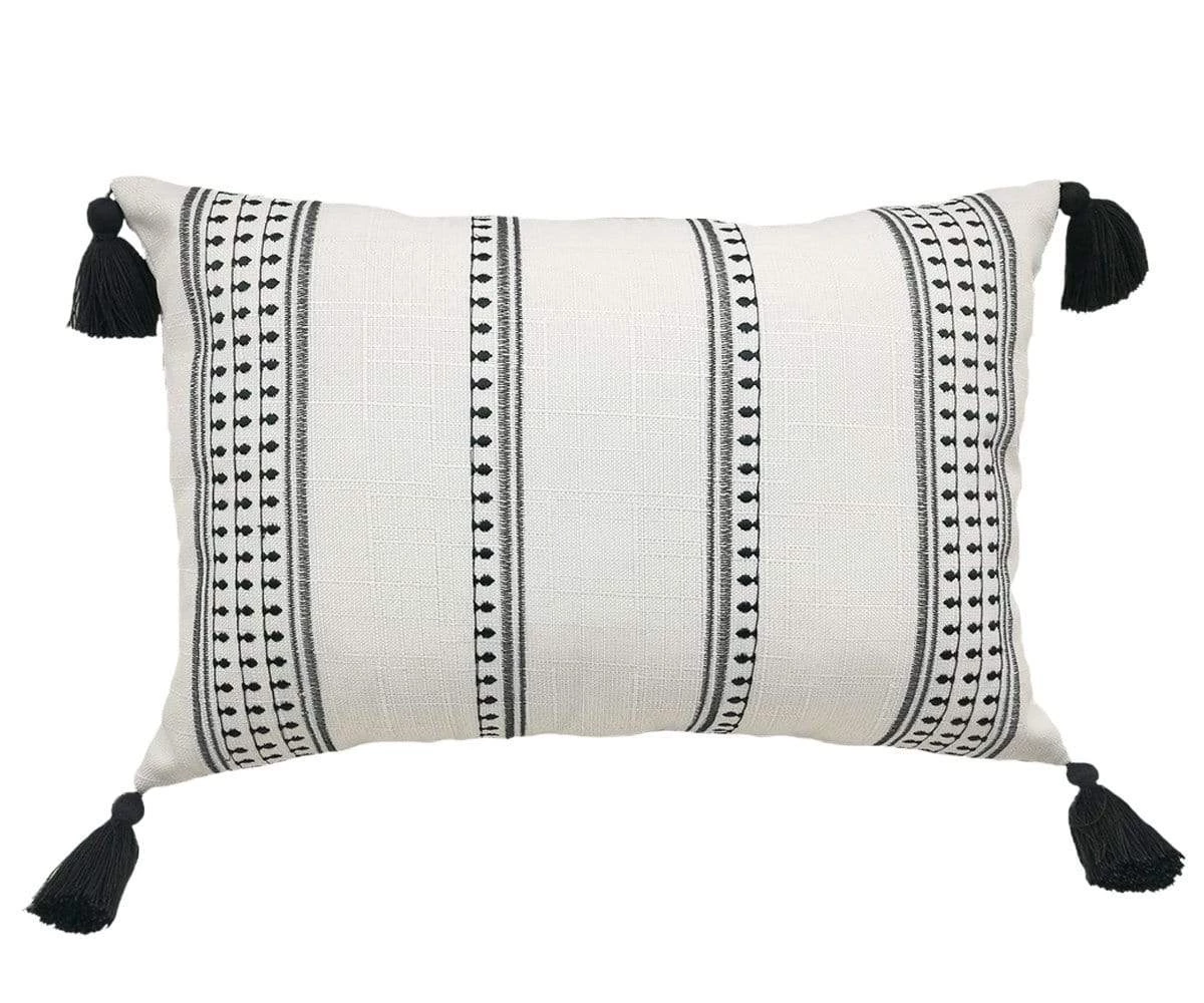 The Textured Stripes Pillow adds an airy sense of light, contemporary style to any space. Featuring embroidered black stripes on a neutral linen background, this pillow combines the textures of detailed embroidery with those of the supple linen in a uniquely lovely way. Layer this pillow with other throw pillows to complete your modern decor in style – this piece effortlessly brings both texture and dimension to any sofa, accent chair or bed where it is placed. Completed by an invisible zipper closure and a set of breezy tassels, this pillow is an incredibly versatile accent to add to any room. Made of a poly-linen blend, this pillow offers the durability of polyester while retaining the luxurious feel of linen. Note: pillow insert is sold separately.