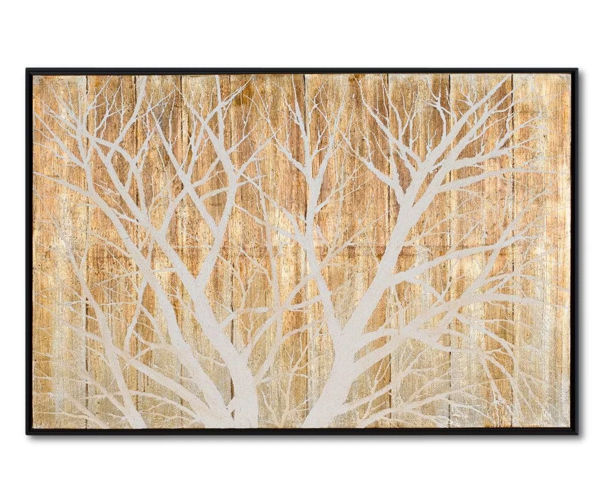 The Helsinki Oil Painting features a play on layers and texture with the wood look behind the clean silhouette of a branching tree, complemented by a striking black frame.